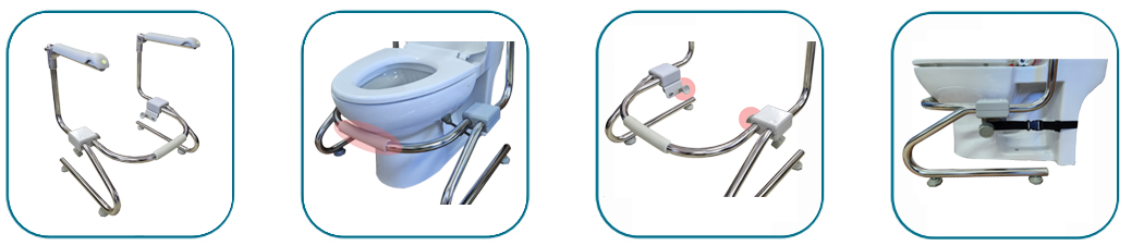 보조벨트를 변기 후면에 감싸면서 양끝을 안전손잡이에 연결시켜 고정을 보강합니다.